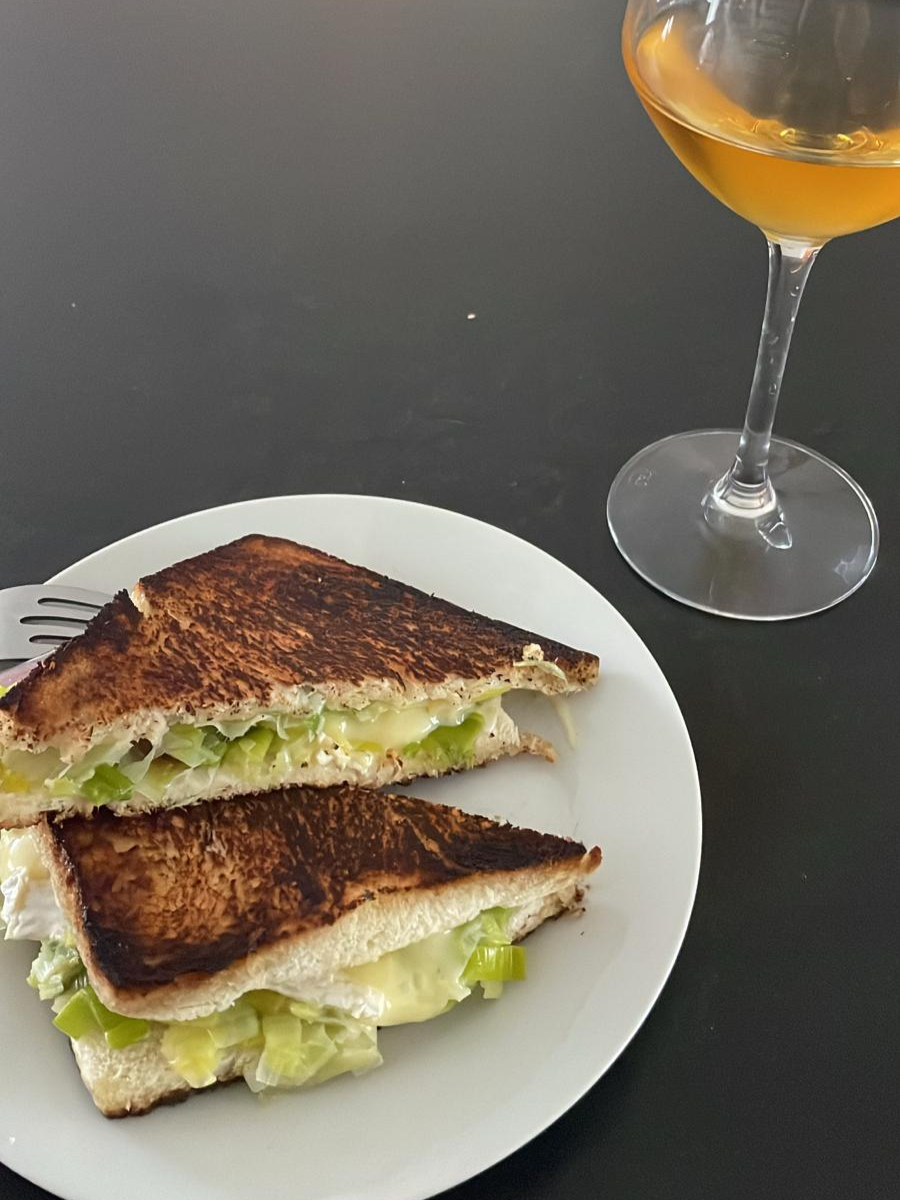 5 - Déposez deux morceaux de fromage sur la tranche inférieure de pain de mie, puis recouvrez de fondue de poireaux.
